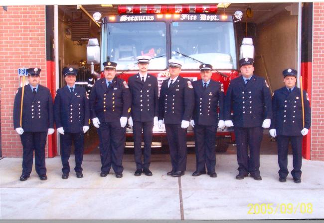 FF D. Earle, Ex-Capt. W. Sallick, Ex-Chief F.Walters, Lt. A. Smentkowski, Capt. F. Schneider, Ex-Capt. R. Grewe, FF K. Roberts & FF V. Massaro |