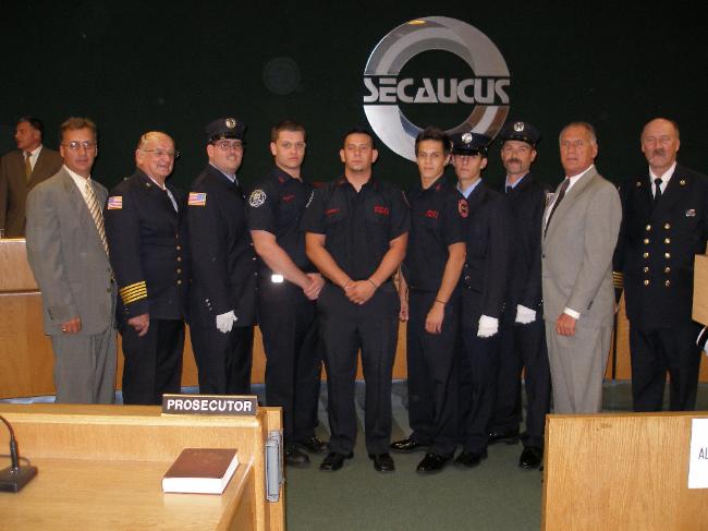 New Firefighters sworn in to the Secaucus Volunteer Fire Department Left to Right: Councilman & Deputy Chief M. Gonnelli, Battalion Chief G. Schoenrock, new firefighters - G. Lentini (Tower 2), R. Pachon, S. Miranda & A. Burgos (Engine 2 / Rescue 1), G. Rabbit (Engine 4 / Ladder 1), R. Zemak (Tower 2), Mayor D. Elwell & Chief R. Parisi. October 14, 2008 |